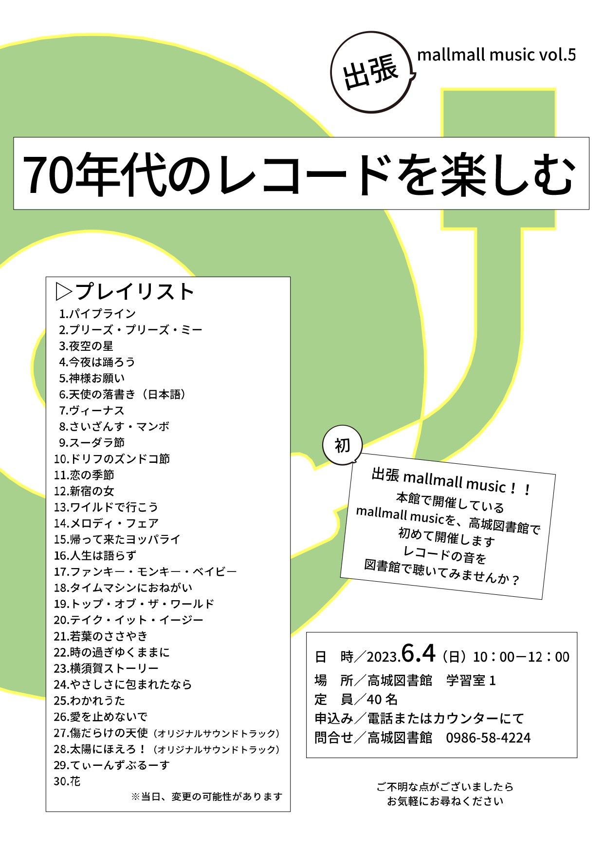 | 内容 | 『出張』mallmall music vol.5「70年代のレコードを楽しむ」 初めての『出張』mallmall music。 本館で開催しているmallmall musicを、高城図書館で初めて開催します。 今回のテーマは「70年代のレコードを楽しむ」。 ぜひ、図書館でレコードを楽しんでください。 ▷プレイリスト 1.パイプライン 2.プリーズ・プリーズ・ミー 3.夜空の星 4.今夜は踊ろう 5.神様お願い 6.天使の落書き(日本語) 7.ヴィーナス 8.さいざんす・マンボ 9.スーダラ節 10.ドリフのズンドコ節 他 全30曲 (当日変更の可能性あり) |