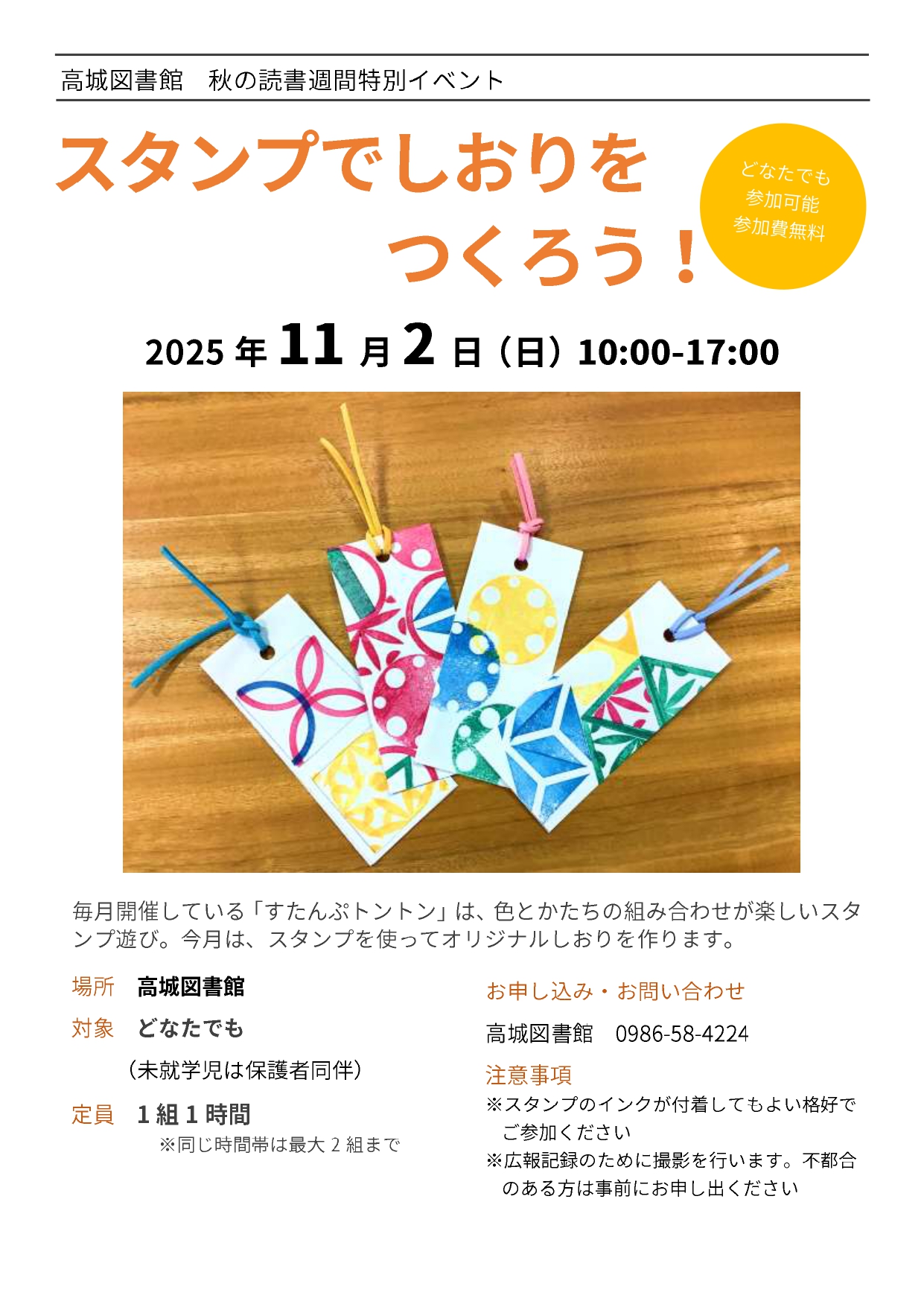 内容 | 毎月開催している「すたんぷトントン」は、色とかたちの組み合わせが楽しいスタンプ遊び。 今月は、スタンプを使って自分だけのしおりを作ります。 ぜひご参加ください! |