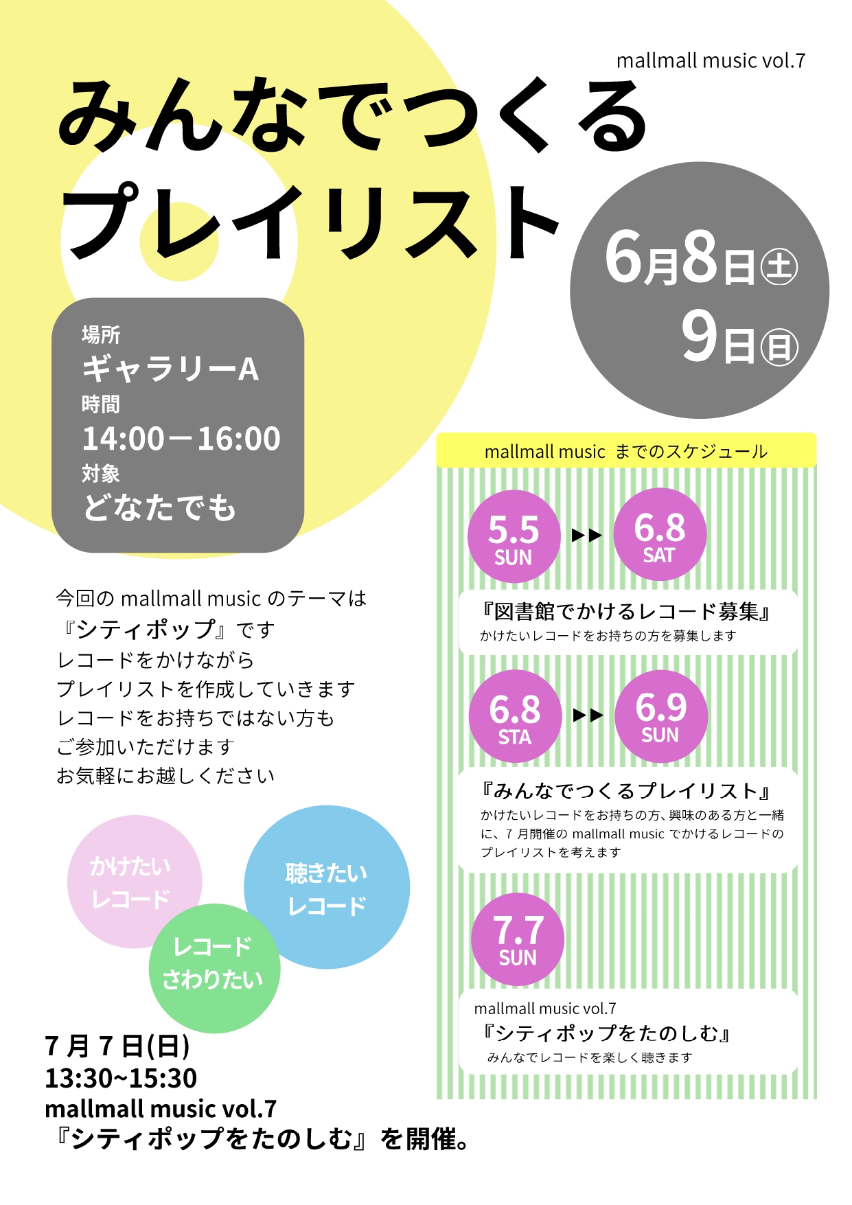 | 内容 | 7月7日(日)に開催する 『mallmall music vol.7 シティポップをたのしむ』の プレイリストを作成します。 今回のmallmall music のテーマは『シティポップ』。 事前に募集したレコードを持ち寄り、 レコードをかけながらプレイリストを作成していきます。 レコードをお持ちではない方もご参加いただけます。 お気軽にお越しください。 |
