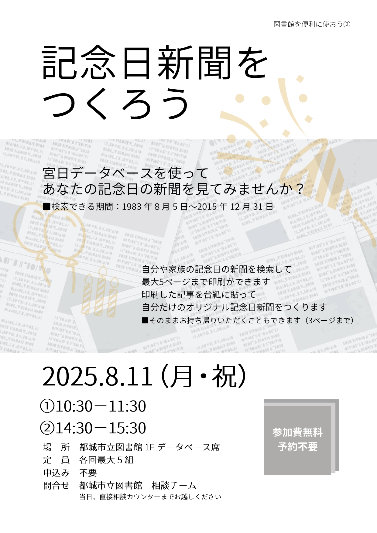 | 内容 | 宮日データベースを使って あなたの記念日の新聞を見てみませんか? ■検索できる期間:1983年8月5日~2015年12月31日 ・自分や家族の記念日の新聞を検索して 最大5ページまで印刷ができます。 印刷した記事を台紙に貼って 自分だけのオリジナル記念日新聞をつくります。 ■そのままお持ち帰りいただくこともできます(3ページまで) |