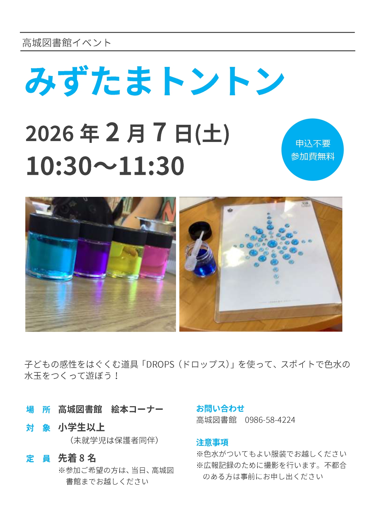 | 内容 | 感性をはぐくむ道具「DROPS(ドロップス)」を使って、スポイトで色水の水玉をつくって遊びます。 |