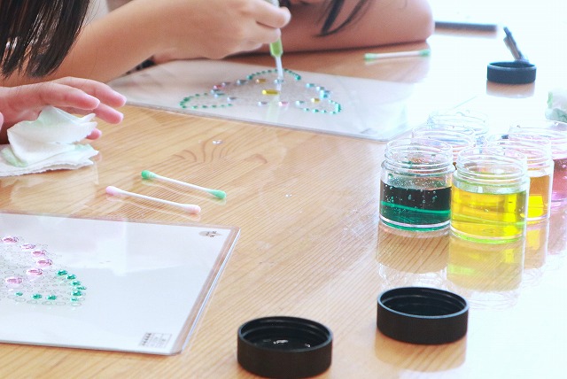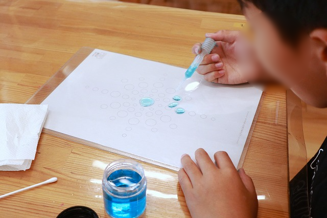 内容 | 感性をはぐくむ道具「DROPS(ドロップス)」を使って、スポイトで色水の水玉を落として遊びます。色水がついてもよい服装でお越しください。 |