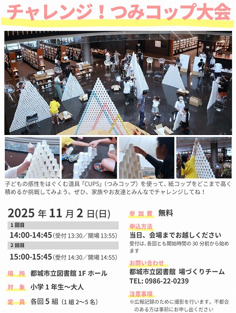 内容 | 子どもの感性をはぐくむ道具「CUPS」(つみコップ)を使って、紙コップをどこまで高く積めるか挑戦してみよう。ぜひ、家族やお友達とみんなでチャレンジしてね! |