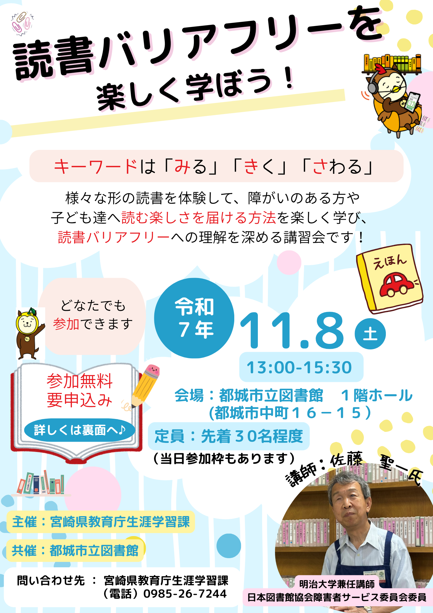 詳細 | 12:30~ 受付 13:00~ 開会 13:05~ 【講義】「読書バリアフリーって何?」 講師:佐藤聖一氏(明治大学兼任講師 日本図書館協会障害者サービス委員会委員) 【体験会】 アクセシブルな書籍の体験会 質疑応答/情報交換 15:20~ 閉会 ※15:30終了予定 |