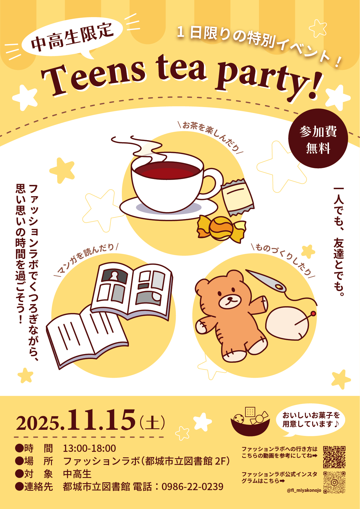| 内容 | 1日限りの特別イベント! 中高生限定の「Teens tea party!」を開催します。 ファッションラボで、お茶を楽しんだり、マンガを読んだり、ものづくりしたり…。 一人でも、友達とでも。 ファッションラボでくつろぎながら、思い思いの時間を過ごそう! 美味しいお菓子とお茶を用意しています♪ |
