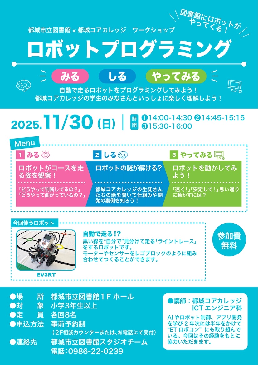 | 問い合わせ先 | 都城市立図書館 スタジオチーム 電話:0986-22-0239 |