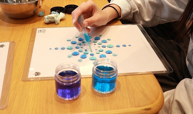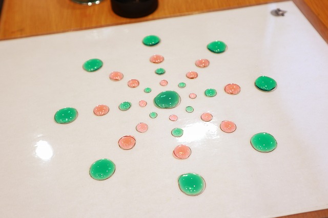 | 内容 | 感性をはぐくむ道具「DROPS(ドロップス)」を使って、スポイトで色水の水玉を落として遊びます。色水がついてもよい服装でお越しください。 |