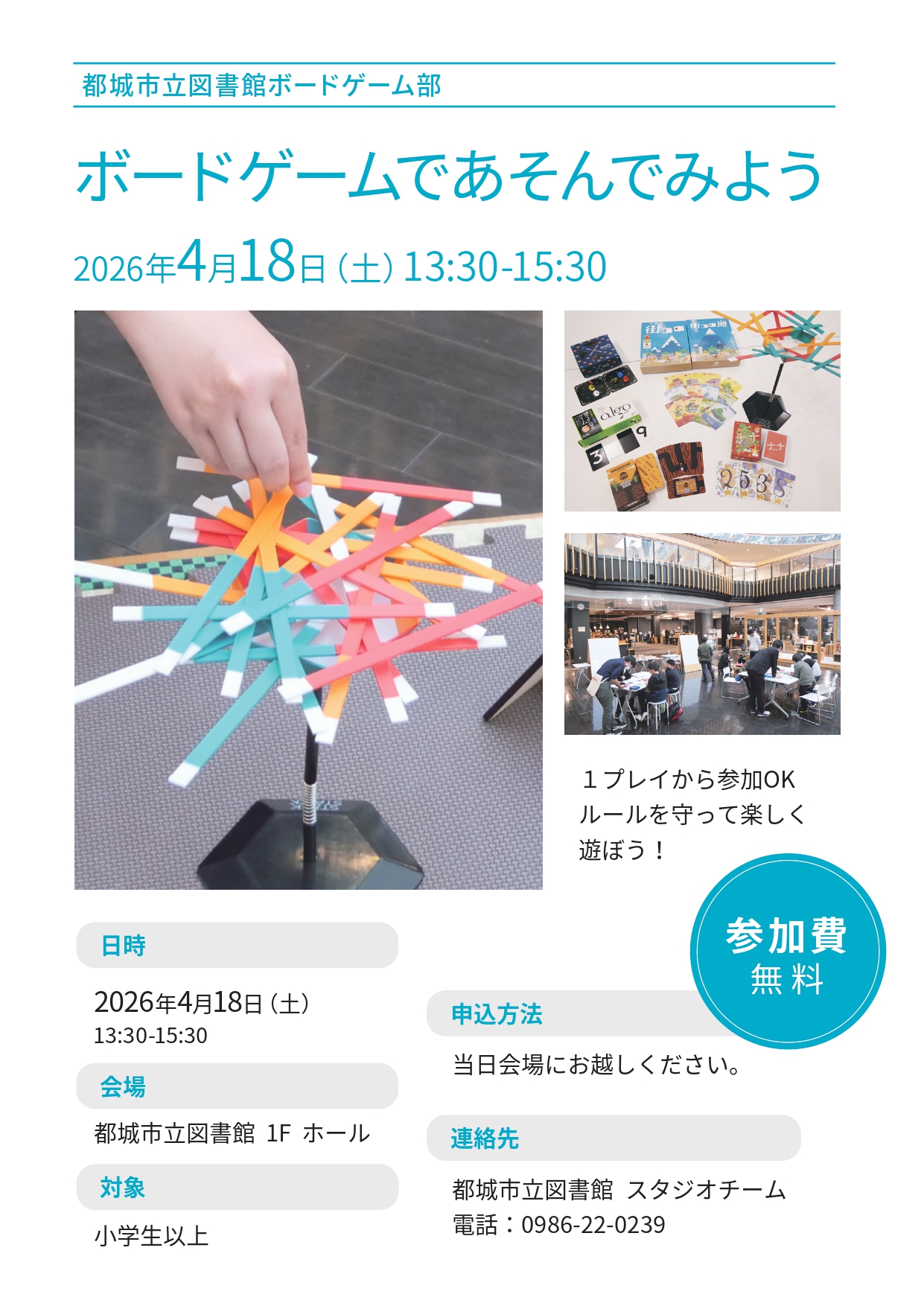 | 内容 | 図書館ホールで、いろんなボードゲームであそぶイベントです。 1プレイから参加OKです。 〈プレイできるボードゲーム〉(予定) ・ブロックス ・mob7 ・スティックスタック ・アールライバルズ など |