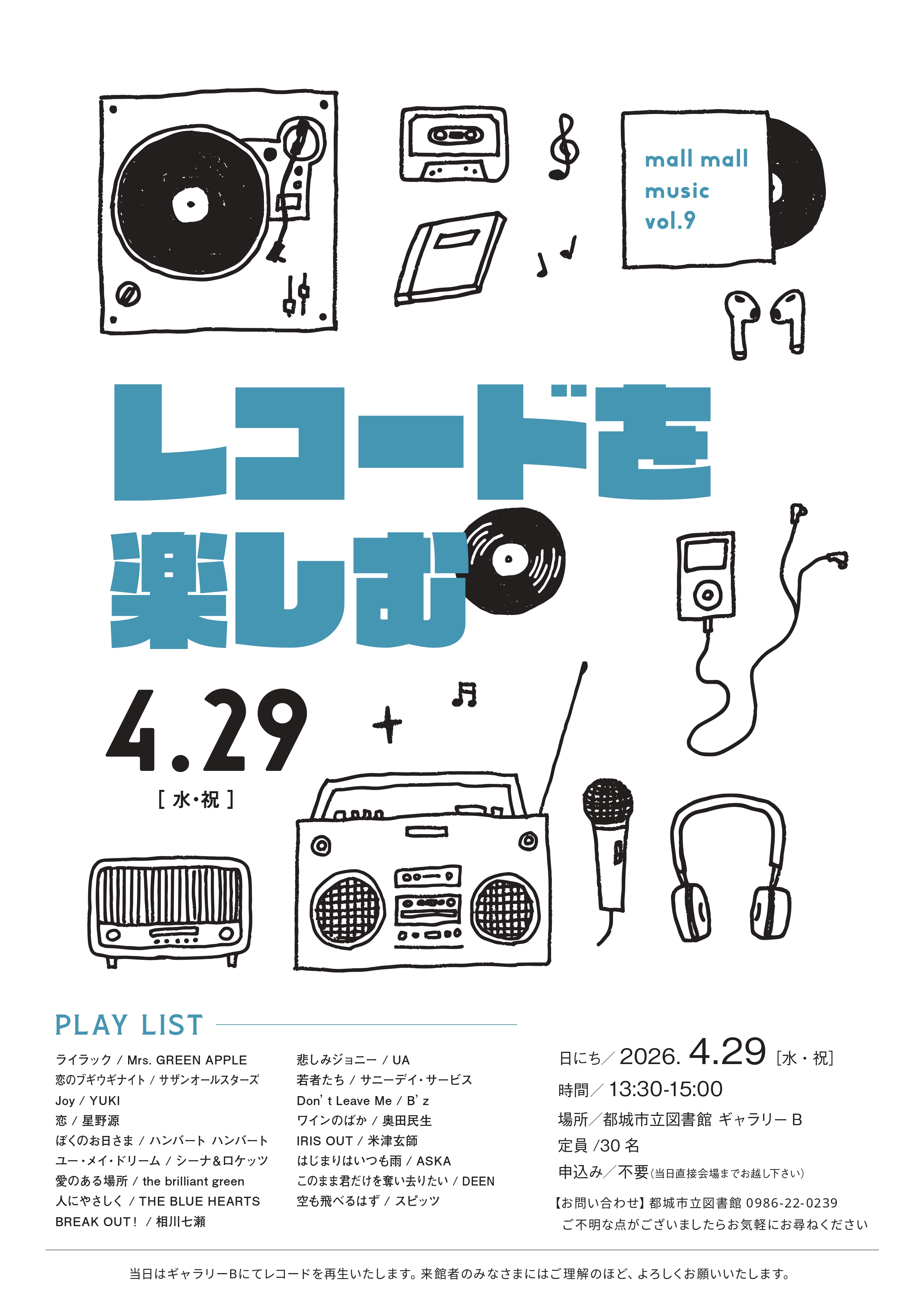 | 詳細 | 【日時】 2026年4月29日(水・祝)/13:30-15:00 【場所】 都城市立図書館 ギャラリーB 【定員】 30名 申込み不要 ◎当日、直接会場までお越し下さい |
